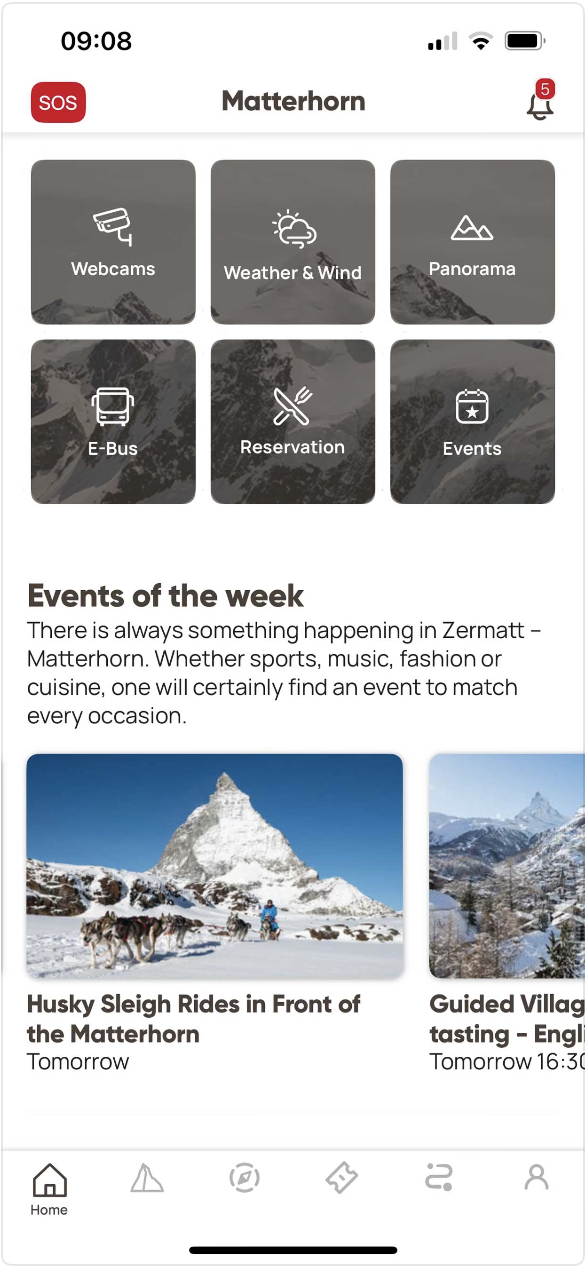 The Matterhorn app is the ideal travel companion for your visit to Zermatt – Matterhorn. Which cable cars, ski slopes, bike or hiking trails are open? Is the weather likely to change? Can I book a table in my favourite restaurant? Where is the next e-bus in the village in real time? Analyse ski days, piste kilometres, lift rides or altitude metres with the ‘Peak Track’ feature?